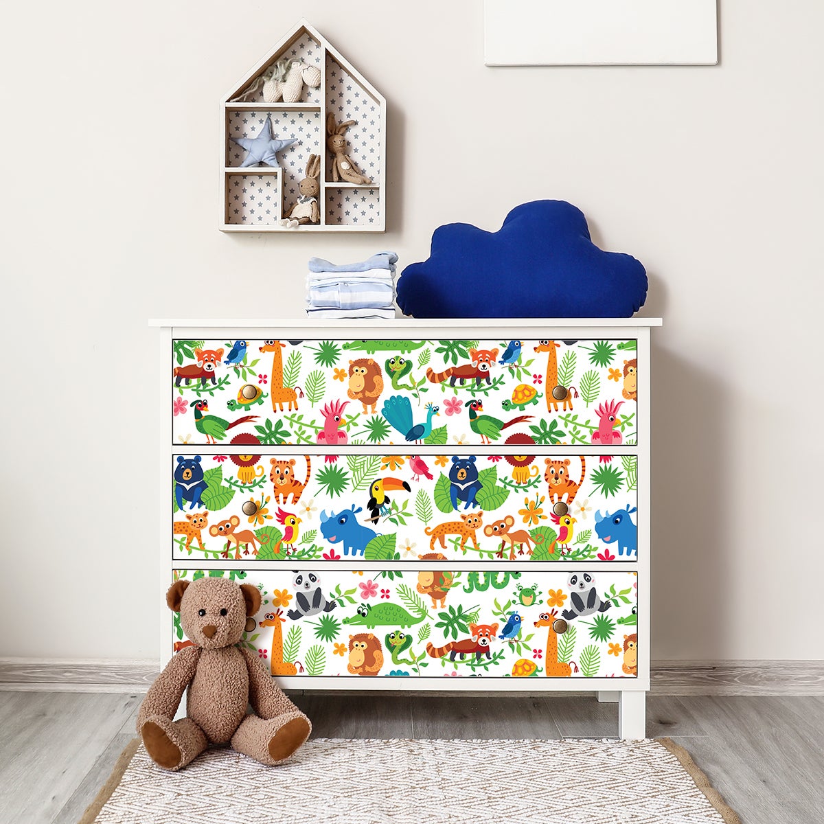 Más información Este enlace se abrirá en una nueva ventanaSuperficie cubierta para 1 cantidad: 0.54 metro cuadrado.¡Vinilos decorativos Imitación muebles para niños para interiores y decoración! Con los vinilos muebles para niños y este Pegatina muebles para niños animales en la selva es possible transformar la decoración de su casa. Dimensiones de adhesivo muebles para niños : 40 x 60 cm 60 x 90 cm ¿Donde pegar estos adhesivos de paredes? Fácil de instalar y se adapta a todos los muebles !