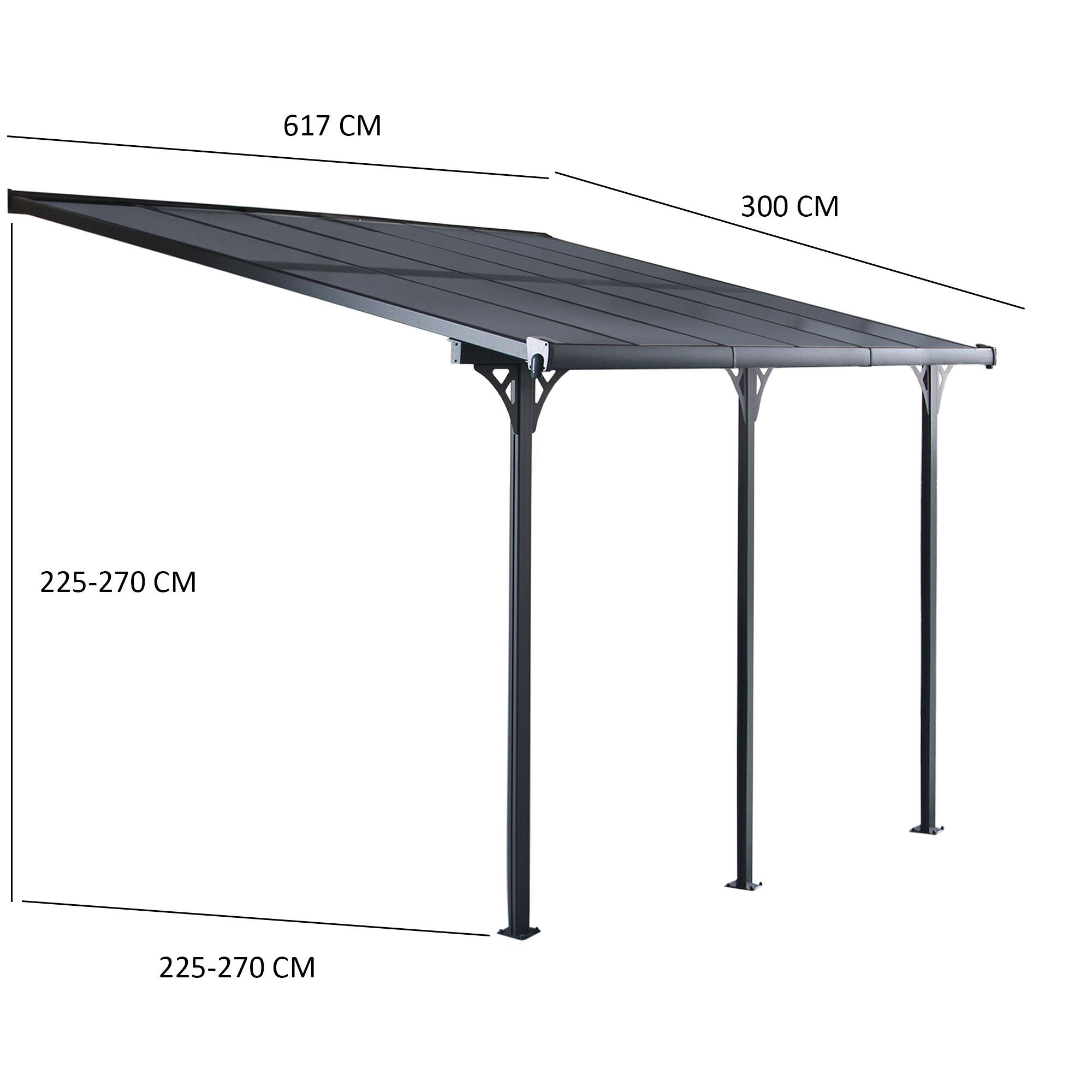 Más información Este enlace se abrirá en una nueva ventanaMarquesina Elliot fabricada en aluminio y policarbonato de 6,17 x 3 m y 18,8 metros cuadrados. Cuenta con tratamiento color antracita para proteger de la lluvia las puertas y ventanas. Puedes utilizarla para crear un porche en el jardín o una zona cubierta para dejar el coche. Flexibilidad en el montaje: permite ajustar los pórticos de aluminio en horizontal y en profundidad según necesidades. Está fabricada en materiales de alta calidad y resistencia. Cuenta con paneles de policarbonato con tratamiento frente a los rayos ultravioletas con un espesor de 6 mm. Ofrece 3 años de garantía.
