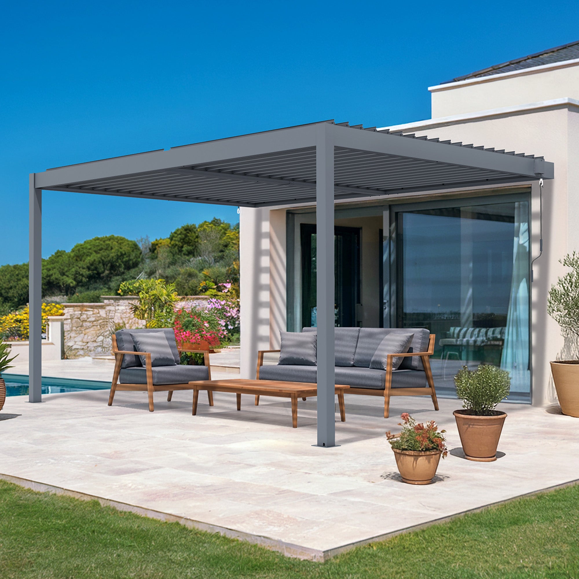 Cree un espacio exterior funcional y elegante con la pérgola bioclimática autoportante PIANA. Esta pérgola con lamas inclinables se adapta al clima al instante: sombra refrescante en verano, protección impermeable en invierno. Una solución elegante para disfrutar de su terraza o jardín todo el año.