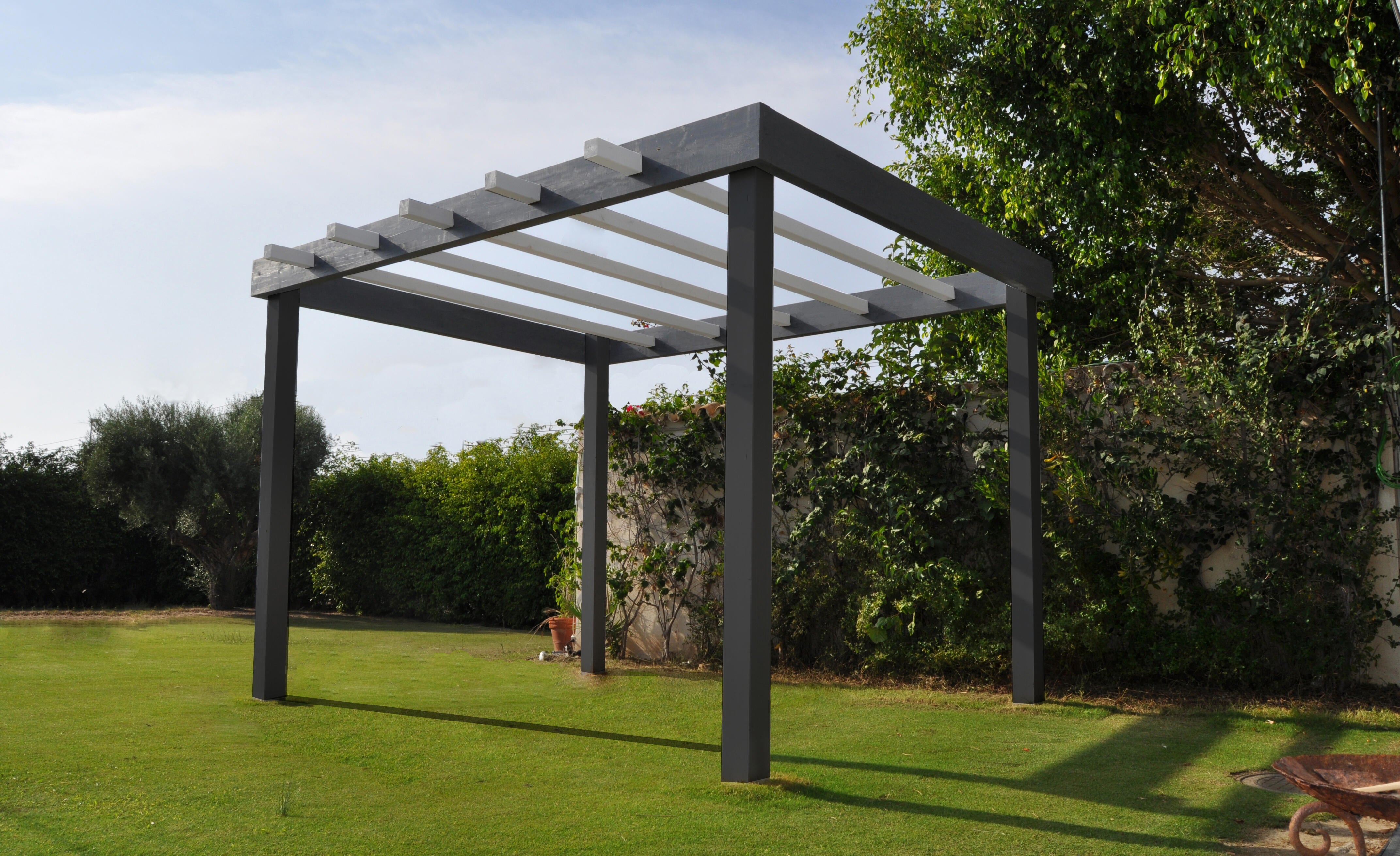 Pérgola Huetor con postes de 12x12 cm. Fabricada en madera laminada de abeto en tonos grises con certificado FSC, procedente de bosques gestionados de manera sostenible, indicada para cubrir una superficie de 12 m². Con mecanizados que facilitan el montaje y durabilidad. Incluye la tornillería y herrajes necesarios para su montaje. Te permitirá disfrutar del aire libre al tiempo que te proteges del sol o de la lluvia. Medidas: 400x240x300 cm (ancho x alto x profundo). Ver cotas en manual de montaje.