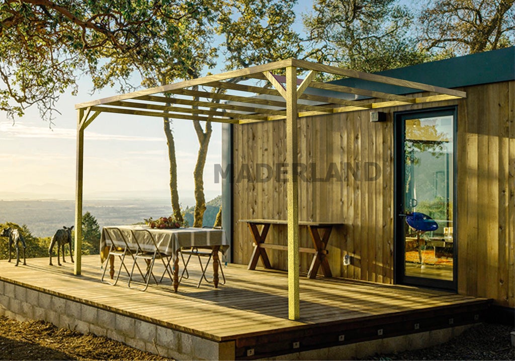 La pérgola de madera adosada TOLEDO está fabricada por Maderland en madera maciza tratada proveniente del norte de Europa, donde el lento crecimiento garantiza unas mejores propiedades mecánicas ante cualquier posible adversidad, mejorando la resistencia a la flexión estática, a la compresión y a la tracción.