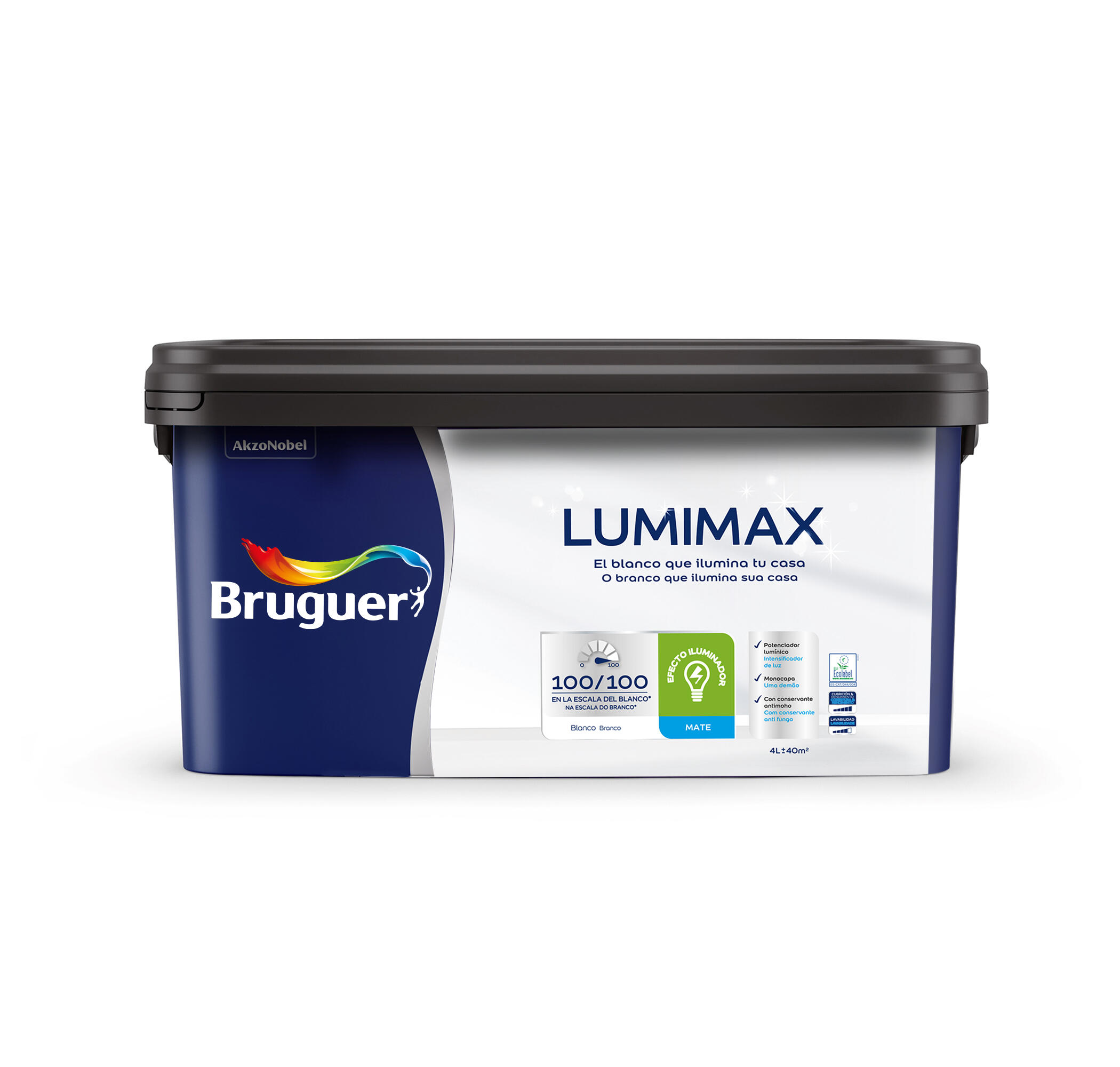 Bruguer Lumimax es una pintura para paredes y techos de interior, blanca, lavable y de acabado mate, ideal para transformar tus habitaciones en espacios más luminosos y acogedores. Gracias a su innovadora fórmula, Bruguer Lumimax refleja eficazmente tanto la luz natural como la artificial, amplificando la luminosidad de la estancia y dando una sensación de espacio abierto y aireado.