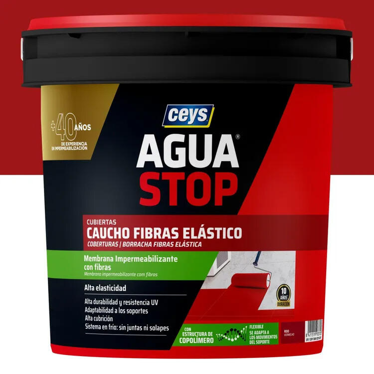 Impermeabilizante AguaStop® Caucho de color rojo, indicado para impermeabilizar tejados planos, cubiertas no circulables, fachadas y balcones. Ofrece una excelente adherencia en soportes porosos, así como un efectivo cosido de fisuras. Se recomienda la aplicación de dos capas para un resultado óptimo. Una vez seco (tras unas 24/48 horas), este impermeabilizante presenta estabilidad dimensional, elasticidad y una gran resistencia mecánica y a la erosión. Es resistente a las heladas y compatible con climas cambiantes. Se aplica fácilmente con brocha, rodillo o pistola. Contenido: 1 kg.