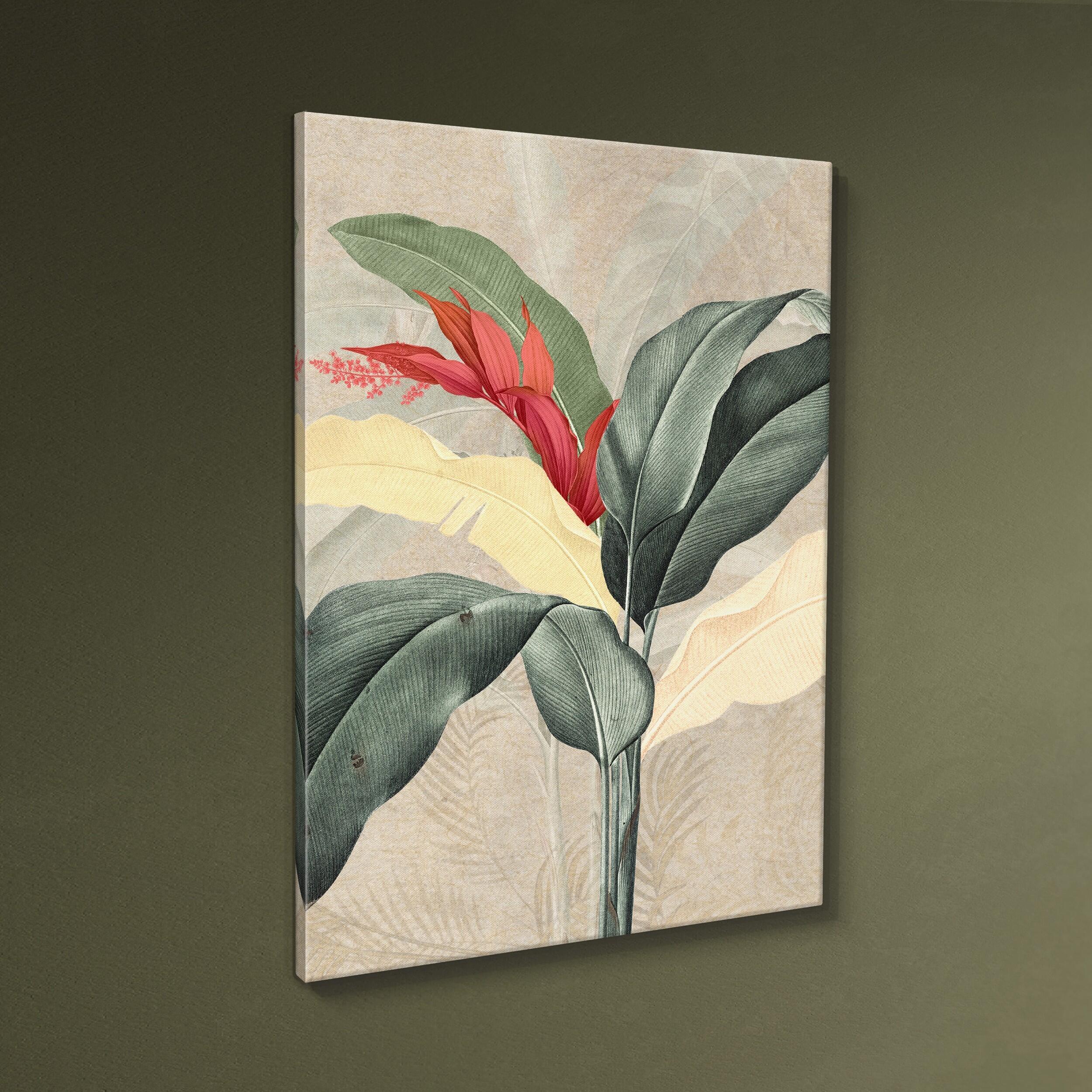 Lienzo decorativo botánico tropical de estilo natural y elegante. Aporta frescura y sofisticación a tus espacios con este cuadro decorativo de inspiración botánica. Su diseño presenta una composición artística de hojas tropicales en tonos verdes, amarillos y una vibrante flor. roja,creando un contraste armonioso que evoca la belleza natural de la selva tropical. creando un contraste armonioso que evoca la belleza natural de la selva tropical. creando un contraste armonioso que evoca la belleza. natural de la selva tropical