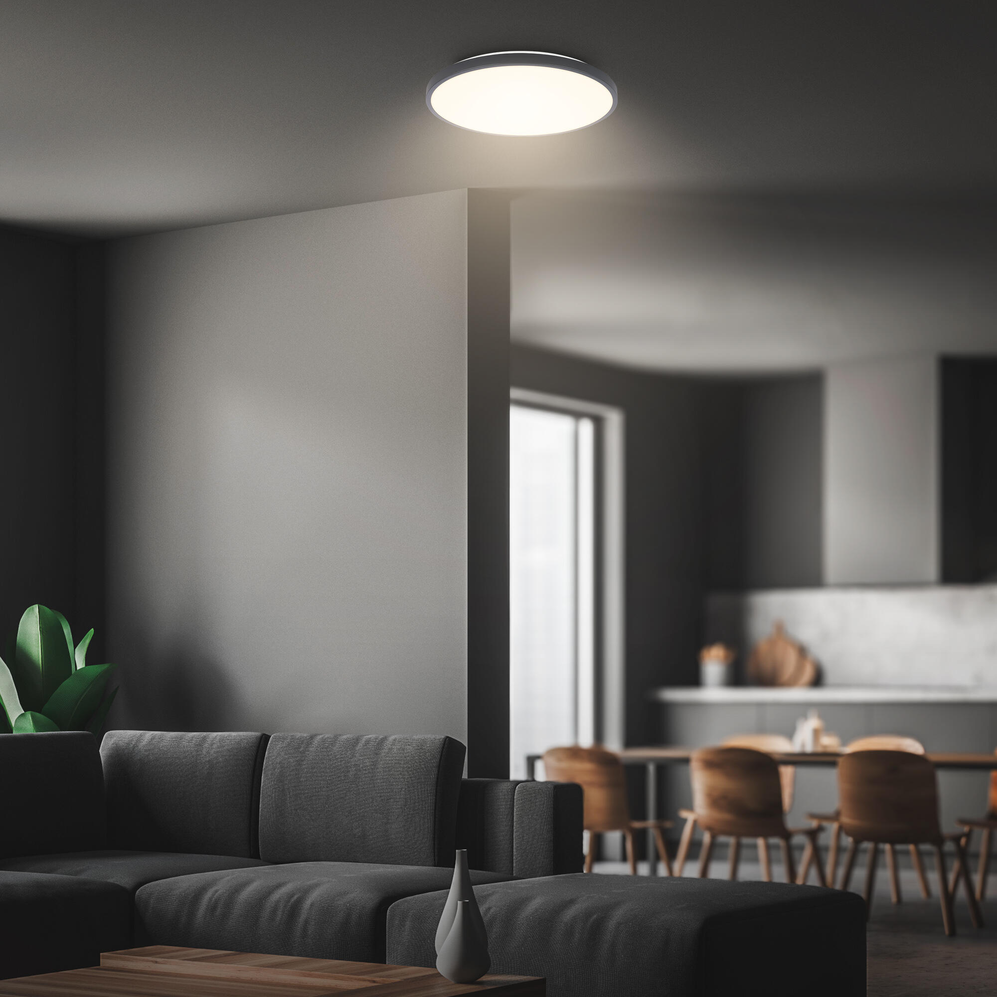Lámpara de techo LED con embellecedor decorativo: Este elegante plasfón LED de salón en color antracita cuenta con un módulo LED integrado de 17,5 W (2.400 lm, 3.000 K) que proporciona una iluminación blanco cálido uniforme para cualquier estancia. Dimensiones compactas: Con un diámetro de 330 mm y una altura de solo 60 mm, esta lámpara de cocina es ideal para espacios amplios o zonas con techos bajos, ofreciendo una solución que ahorra espacio. Material de alta calidad: La superficie metálica con borde en acabado antracita confiere a la lámpara de pasillo un diseño moderno y atemporal que se integra perfectamente en diferentes estilos de decoración. Diseño opalino decorativo: La pantalla de esta lámpara de dormitorio asegura una difusión uniforme de la luz, creando un ambiente agradable y acogedor, perfecto también para salones o pasillos. Uso versátil: Ideal para salones, dormitorios, comedores, cocinas o pasillos, esta lámpara de techo ofrece una combinación armoniosa de funcionalidad y una iluminación elegante. Garantía de 5 años.