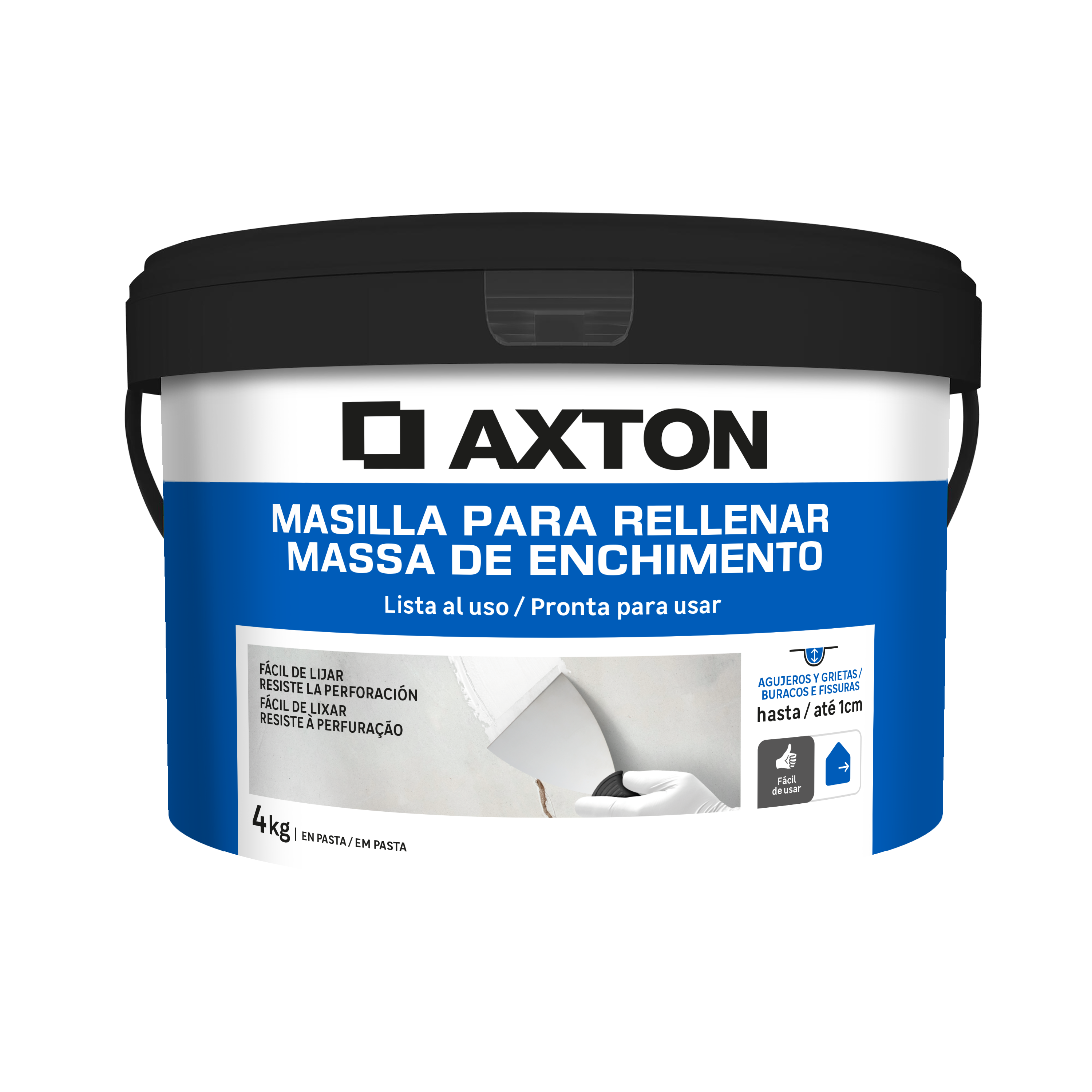 Masilla de relleno en pasta para rellenar agujeros y grietas Axton. Está indicado para rellenar agujeros y grietas en paredes o techos con un espesor de hasta 2 cm. Necesita un tiempo de secado completo de 24 horas y admite fácilmente el lijado. Seca sin mermar y resiste al taladro. Listo para usar y de fácil aplicación. Contenido: 4 kg.