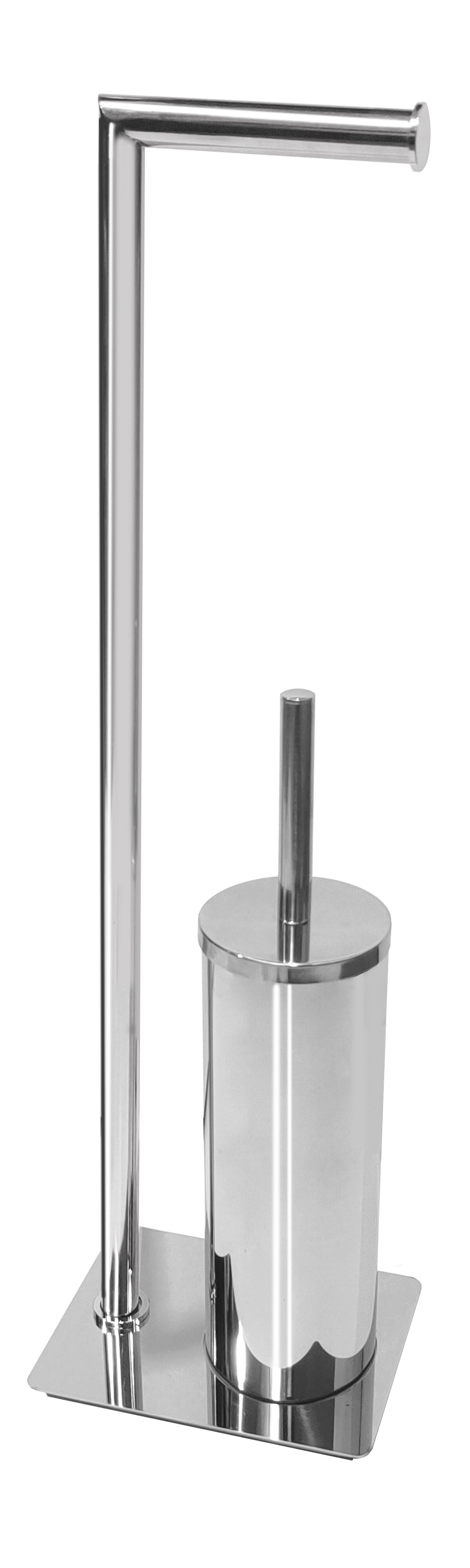 Escobillero y portarrollos de wc para suelo fabricado en España, en acero inoxidable acabado brillo. Escobilla de silicona que no acumula agua y es más higiénica y limpia (con un simple enjuague con el agua del inodoro se elimina el pelo enredado, restos de papel higiénico y la suciedad adherida). Vaso del escobillero con cubeta interior de ABS. Disfruta de un accesorio todo en uno de tamaño reducido, ideal para tener el portarrollos para el papel higiénico y escobillero en tu baño o aseo de estilo moderno. Medidas: 18 x 13,6 x 62,5 (ancho x fondo x alto).