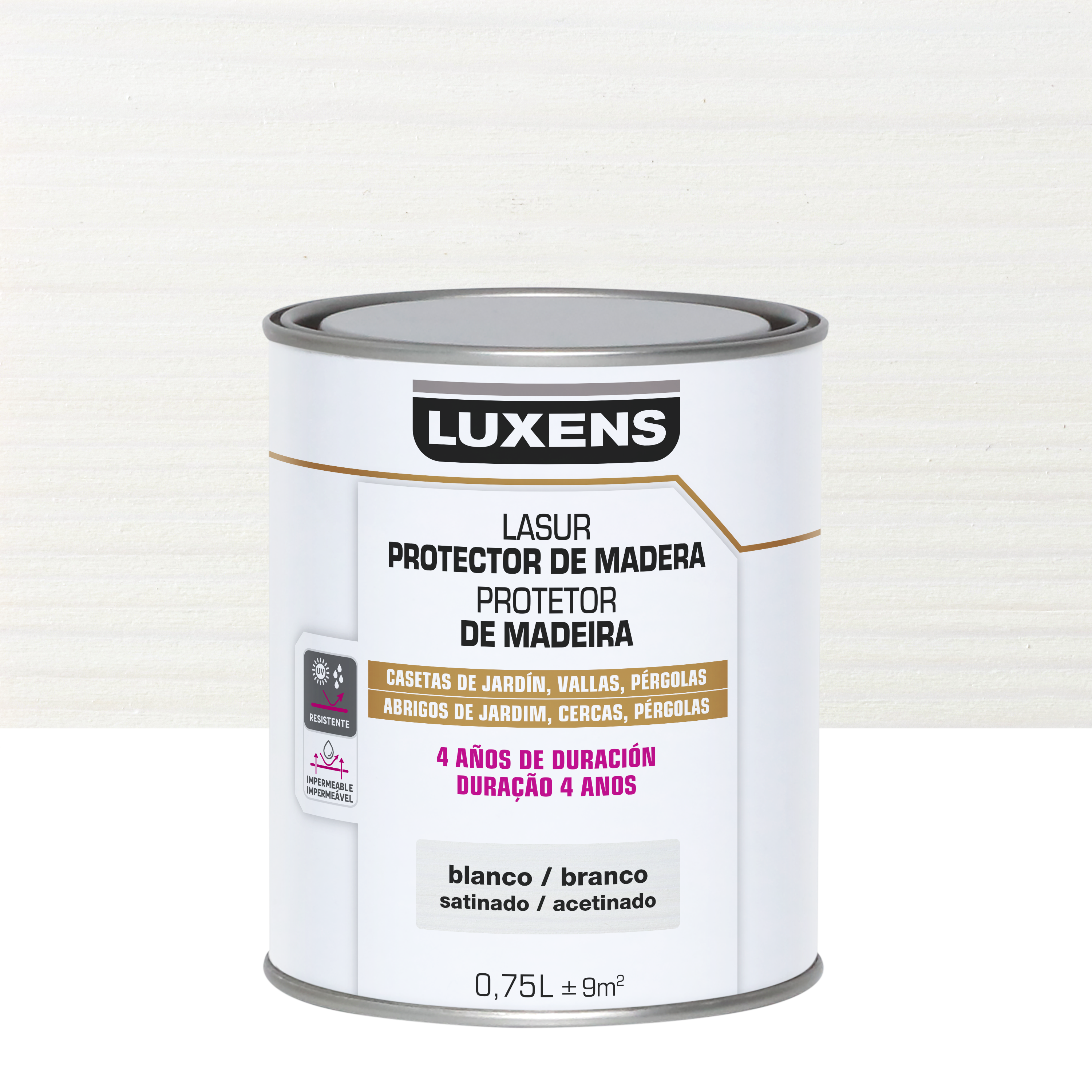 Lasur satinado 4 años Luxens blanco. Es ideal para decorar y proteger la madera interior y exterior de los rayos UV y el mal tiempo. Gracias a su textura en gel que no gotea, este tinte para madera es fácil de aplicar e ideal para superficies verticales (casetas de jardín, cercas, pérgolas). Puede aplicarse con rodillo, pincel o pistola de pulverización. Limpie las herramientas con agua. Al tratarse de un producto peligroso, se recomienda respetar siempre las precauciones de uso. Contenido: 0,75 litros.