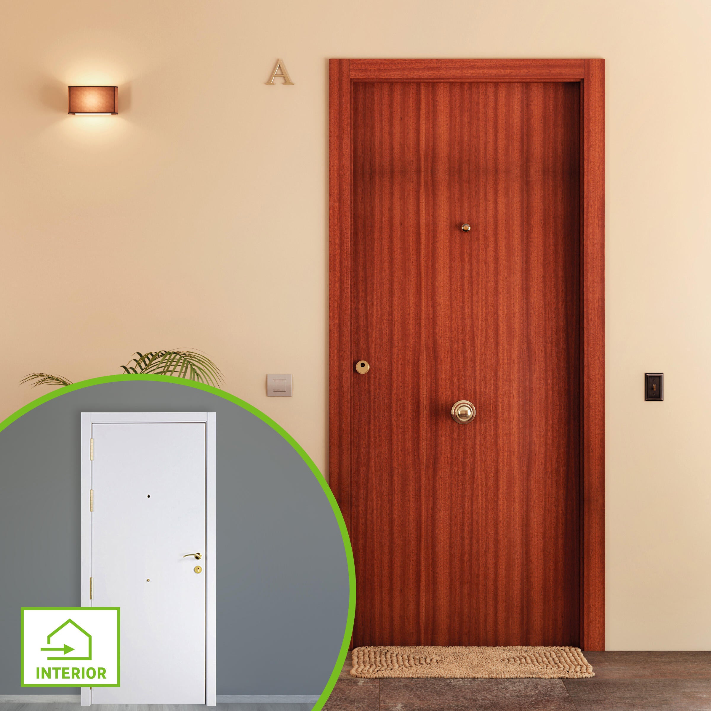 Puerta de entrada blindada lisa, con apertura hacia la derecha, compuesta por marco de MDF revestido, hoja de aglomerado con 2 láminas de acero recubierta de chapa natural en color sapelly, en la cara que da al exterior de la vivienda, y en lacado blanco, en la que da al interior, y herrajes de zamak. El color del herraje es mixto de serie, interior en color cromo y exterior latón. Incluye 4 bisagras antipalanca y cerradura de cilindros de 3 puntos antiperforación. Incluye mirilla, tirador, pomo y 5 llaves planas. Gracias a su doble acabado interior y exterior, podrás tener la puerta que quieres dentro de casa y llenar tu espacio de luminosidad sin perder la coherencia estética con la comunidad de vecinos. Cuenta con la certificación PEFC, que garantiza que la madera procede de bosques gestionados de forma sostenible y respetuosa con el medioambiente. Medidas: 86,7 x 206 x 4,5 cm (ancho x alto x espesor).