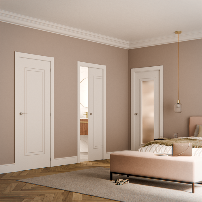 Puerta de interior abatible doble con cristal maciza lacada Line Miramar blanco apertura derecha cerco de 7x3 anchura 145cm