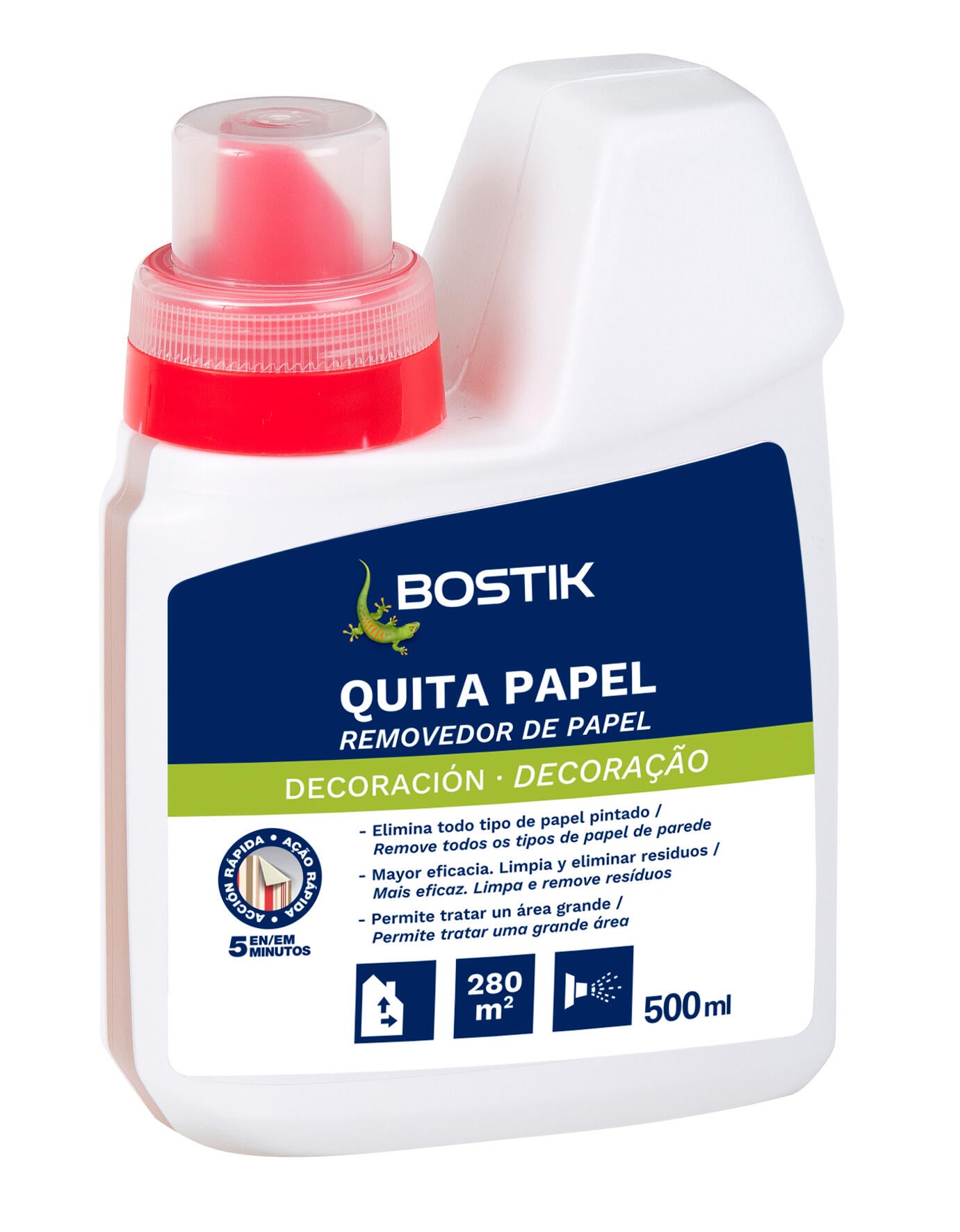 El Quita Papel permite despegar eficazmente todos los papeles pintados antiguos, incluso en capas superpuestas: gruesos, expandibles, lavables, vinílicos, no tejidos o estándar, así como los revestimientos murales con soporte de papel. También permite lavar las paredes y eliminar los residuos de pegamento. Su fórmula es aún más eficaz en todo tipo de paredes y permite tratar una superficie mayor. Se presenta en botes de 500 ml. La unidad mínima de venta es de 12 unidades por caja.