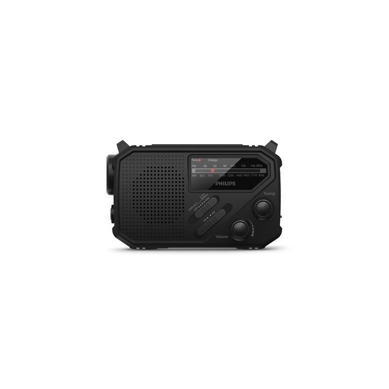 Radio portátil con linterna TAR1609/00 de Philips. Radio fiable, linterna y fuente de alimentación de reserva Con esta pequeña y fantástica radio con linterna, podrás prepararte para cualquier cosa. La antena extensible capta la radio AM y FM, y la potente linterna ilumina tu camino. Incluso tiene una alarma SOS para emergencias, y se carga por cable, luz solar o manivela. - Radio compacta y portátil con linterna - Batería de iones de litio integrada con carga por USB-C - Alimentación de reserva con energía solar o manivela manual - Alarma SOS con sonido y luz intermitente - Sintonización analógica de FM/AM fiable - La correa facilita el transporte de la radio