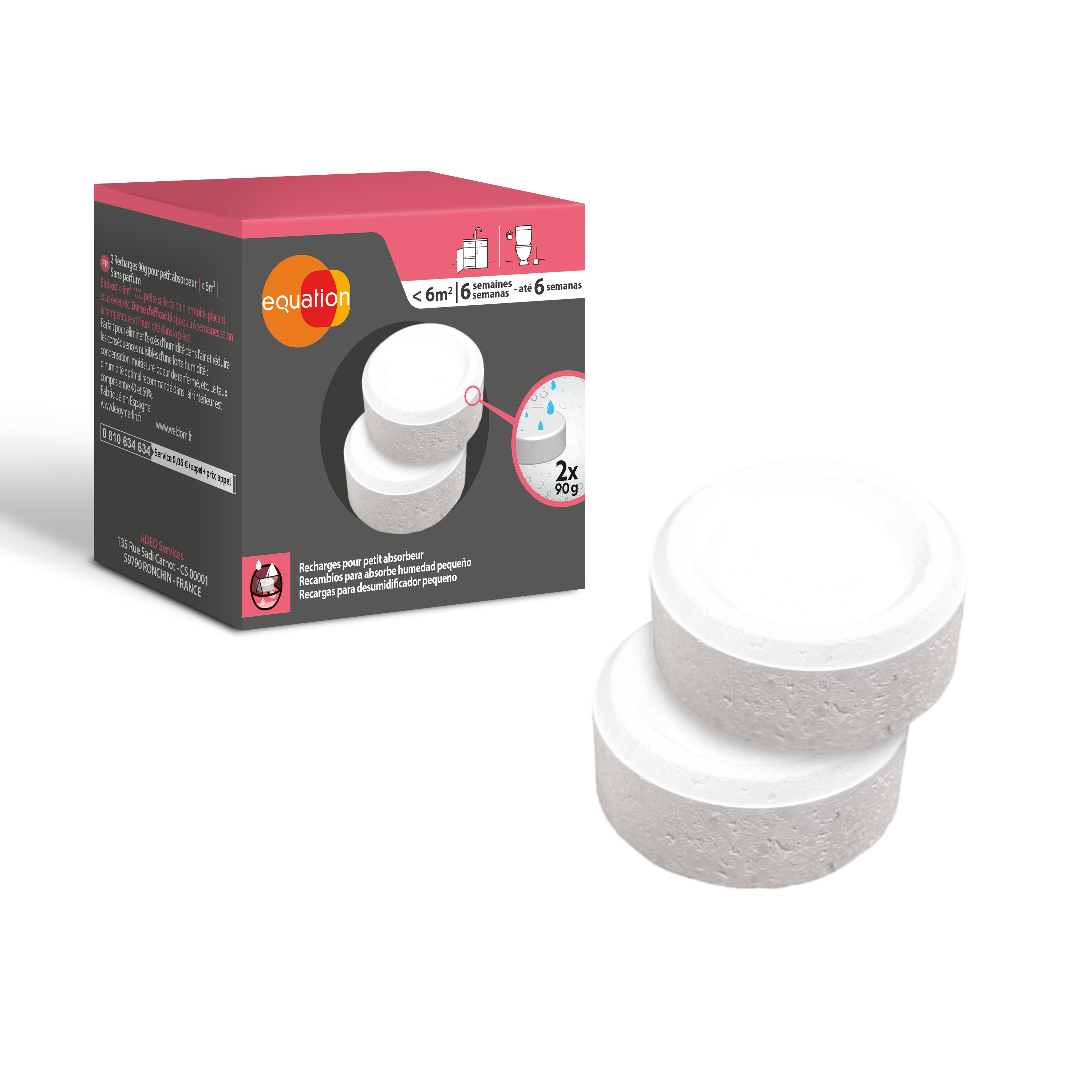Recambio de absorbe humedad EQUATION 90 gr para uso en estancia hasta 6m2. Perfume Neutro. 1 recarga en pastilla. Vida útil 6 semanas.