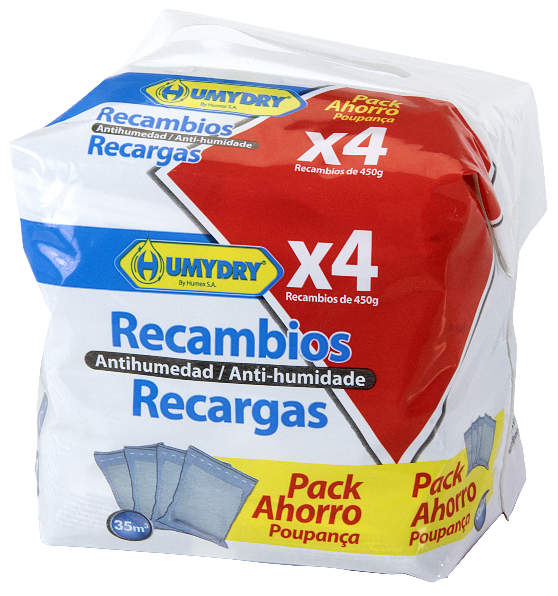 Pack de 4 recambios antihumedad para el dispositivo Humydry de perfume neutro. Es idóneo para regular la humedad del ambiente hasta los niveles óptimos recomendados con una eficacia de 4 a 12 semanas, recomendado para estancias de hasta 15 m².