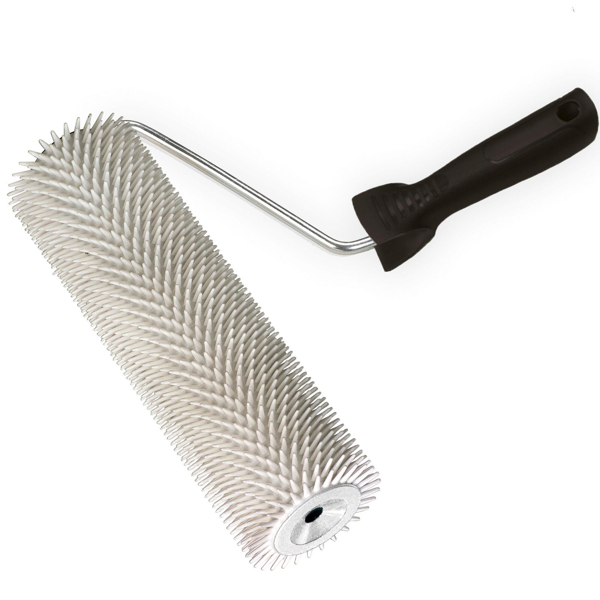 Rodillo aireador de polipropileno de 25 cm, para aplicación de resinas, membranas o clorocauchos en suelos de hormigón, eliminando las burbujas de la superficie. Diámetro exterior de 66 mm con púas redondas de 12 mm, varilla de acero de 8 mm y mango ergonómico de polipropileno.