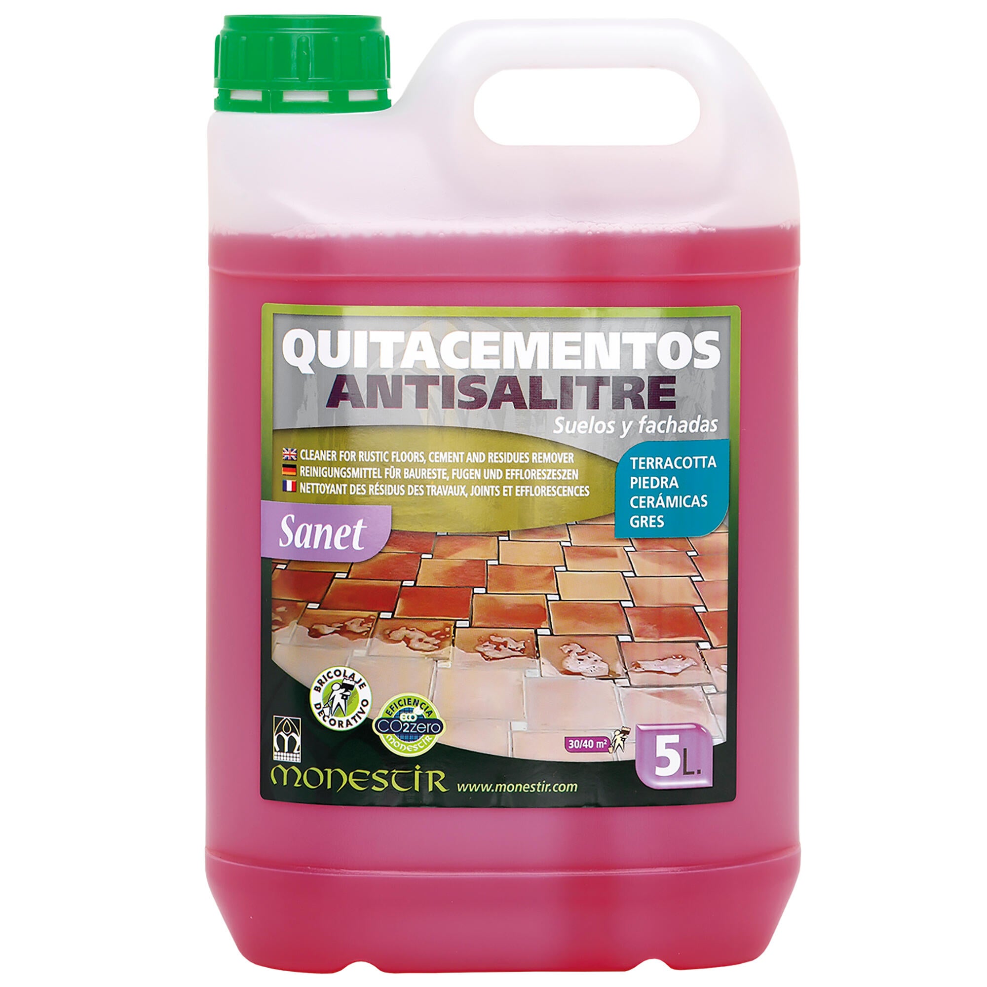 Sanet quitacementos antisalitre Monestir. Elimina residuos de fin de obra, restos de mortero y cemento en todo tipo de pavimentos. También elimina las eflorescencias salinas. Muy eficaz para eliminar salitres en fachadas de ladrillo cara vista. Elimina manchas de óxido. Limpia profundamente la suciedad producida por el polvo y la contaminación en materiales muy porosos de exterior. Se puede emplear para terracota, gres rústico y porcelánico, mármol envejecido, cerámica esmaltada, piedras no pulidas y pizarras. No deteriora el pavimento. No daña las juntas. Respeta los tratamientos, por eso es ideal para eliminar velos blancos formados por la cal del agua del lavado en pavimentos ya tratados.