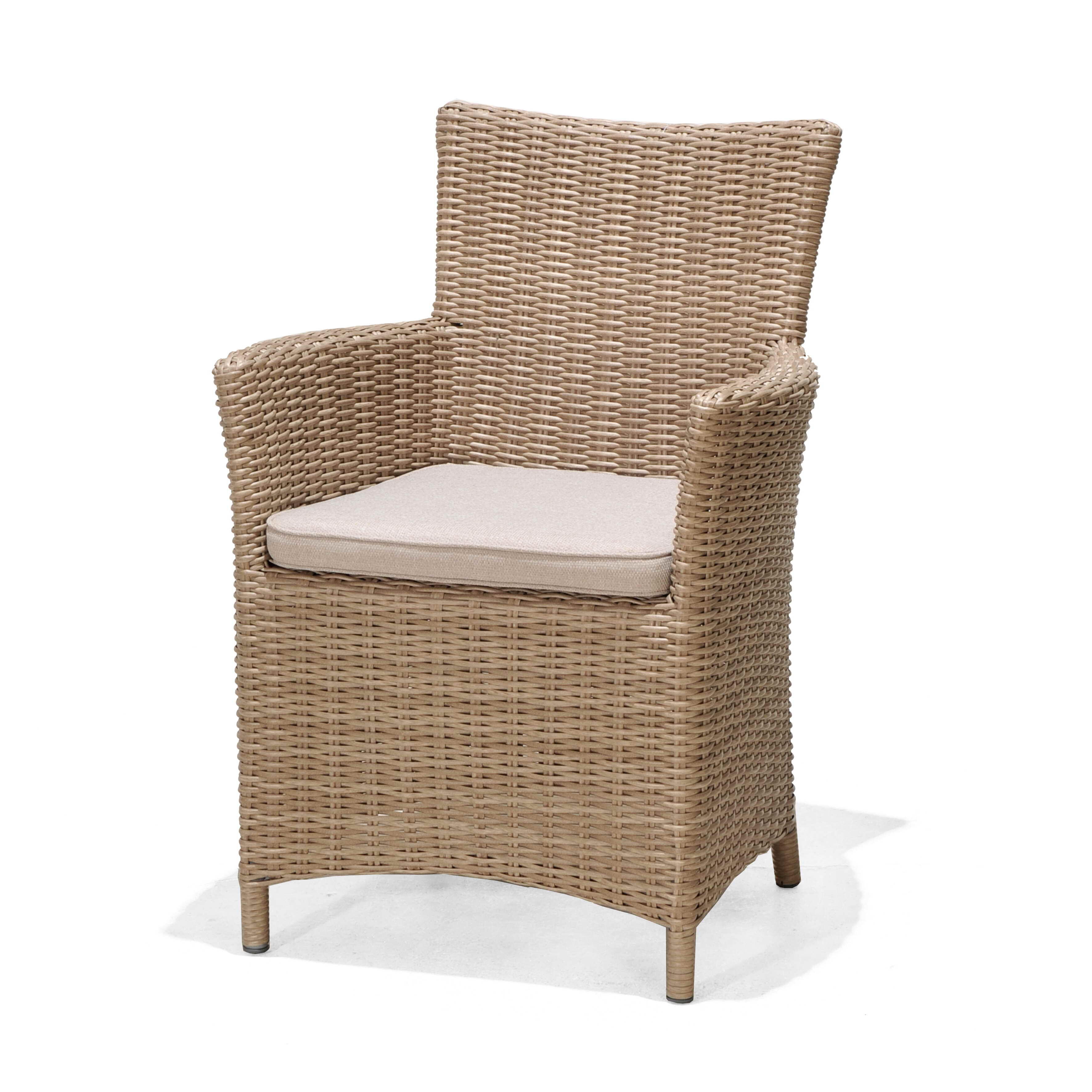 Silla de jardín sin cojín Scancom Basilea con estructura de aluminio y ratán sintético, asiento de ratán sintético y cojín con funda de poliéster. Cuenta con apoyabrazos para mayor comodidad. Se suministra premontado para facilitar su instalación. El ratán sintético soporta la intemperie, pero para prolongar su vida y elasticidad se recomienda protegerlo, siempre que no se necesite, con parasoles, techados o fundas. Este producto dispone de la certificación UNI EN 581 para mobiliario de exterior; esto significa que todos sus componentes cumplen los requisitos generales de seguridad para un uso doméstico, público o de camping. Soporta un peso máximo de 100 kg. Medidas: 65 x 87 x 64 cm (ancho x alto x fondo).