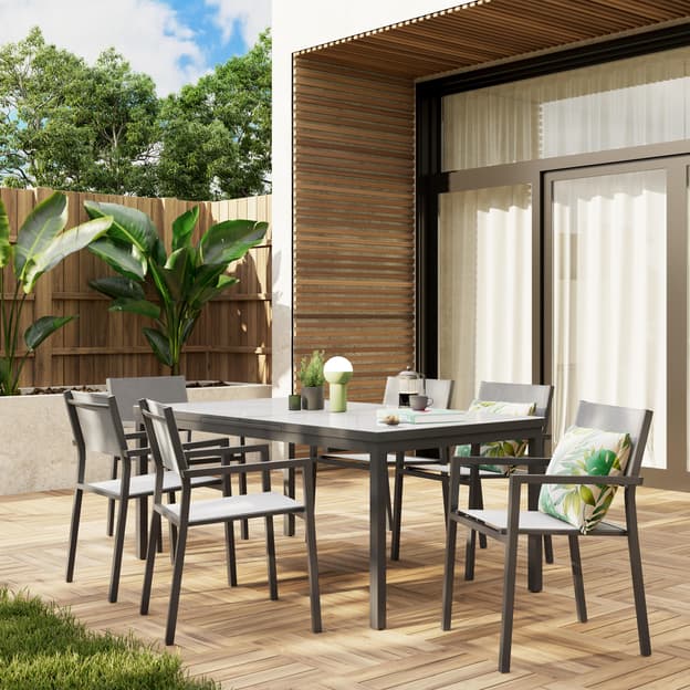 Sillón de jardín sin cojín Naterial. Cuenta con estructura fabricada en aluminio de color gris y negro y asiento de textileno. Ideal para disfrutar de momentos de relax al aire libre. Es apilable, por lo que se almacena fácilmente, y viene premontado. Ofrece 3 años de garantía. Medidas: 55 x 87,5 x 56,5 cm (ancho x alto x fondo).