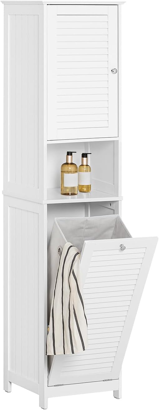 SoBuy Mueble Columna de Baño con 1 Cesto para Ropa Sucia Armario Alto para Baño con 1 Puerta y 3 Estantes 40 x 38 x 170 cm Blanco BZR124-W