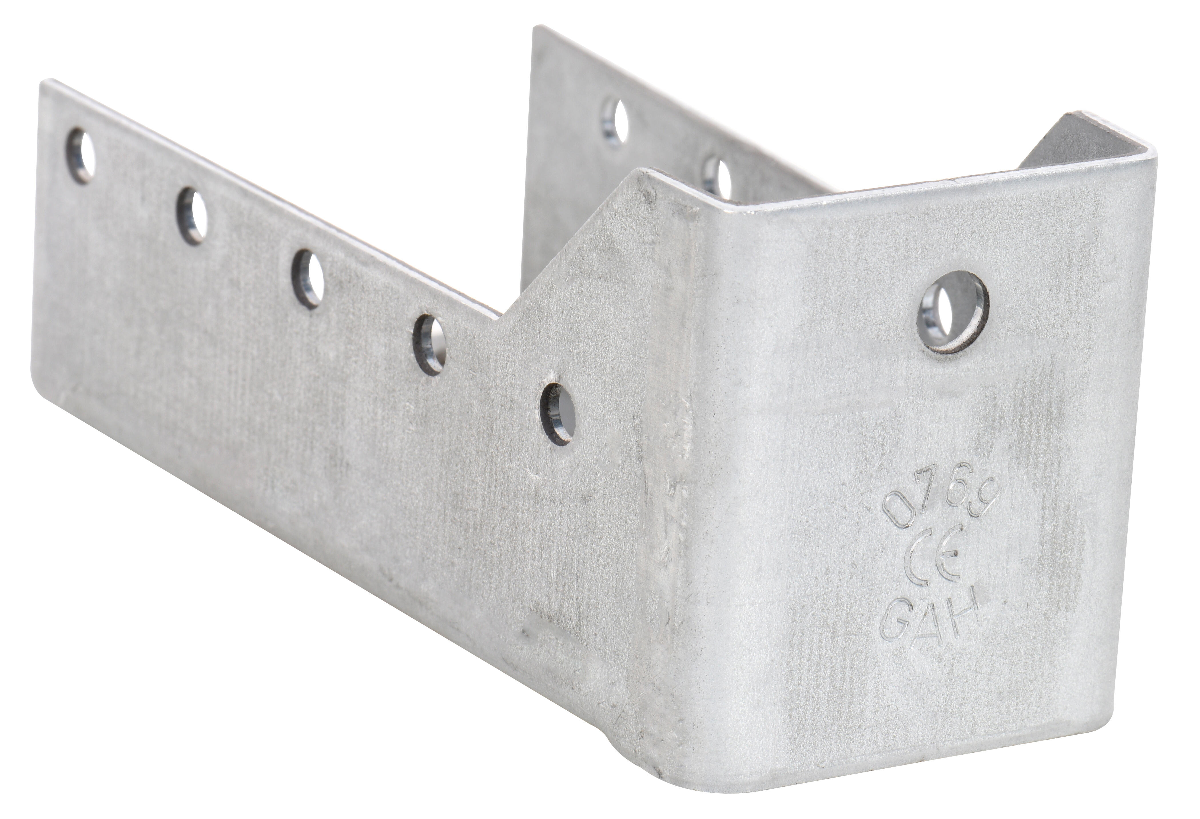 Soporte en U con alas interiores fabricado en acero galvanizado, indicado para conectar vigas. Espesor de 2 mm. Medidas: 14 x 71 x 110 mm (ancho x alto x fondo).