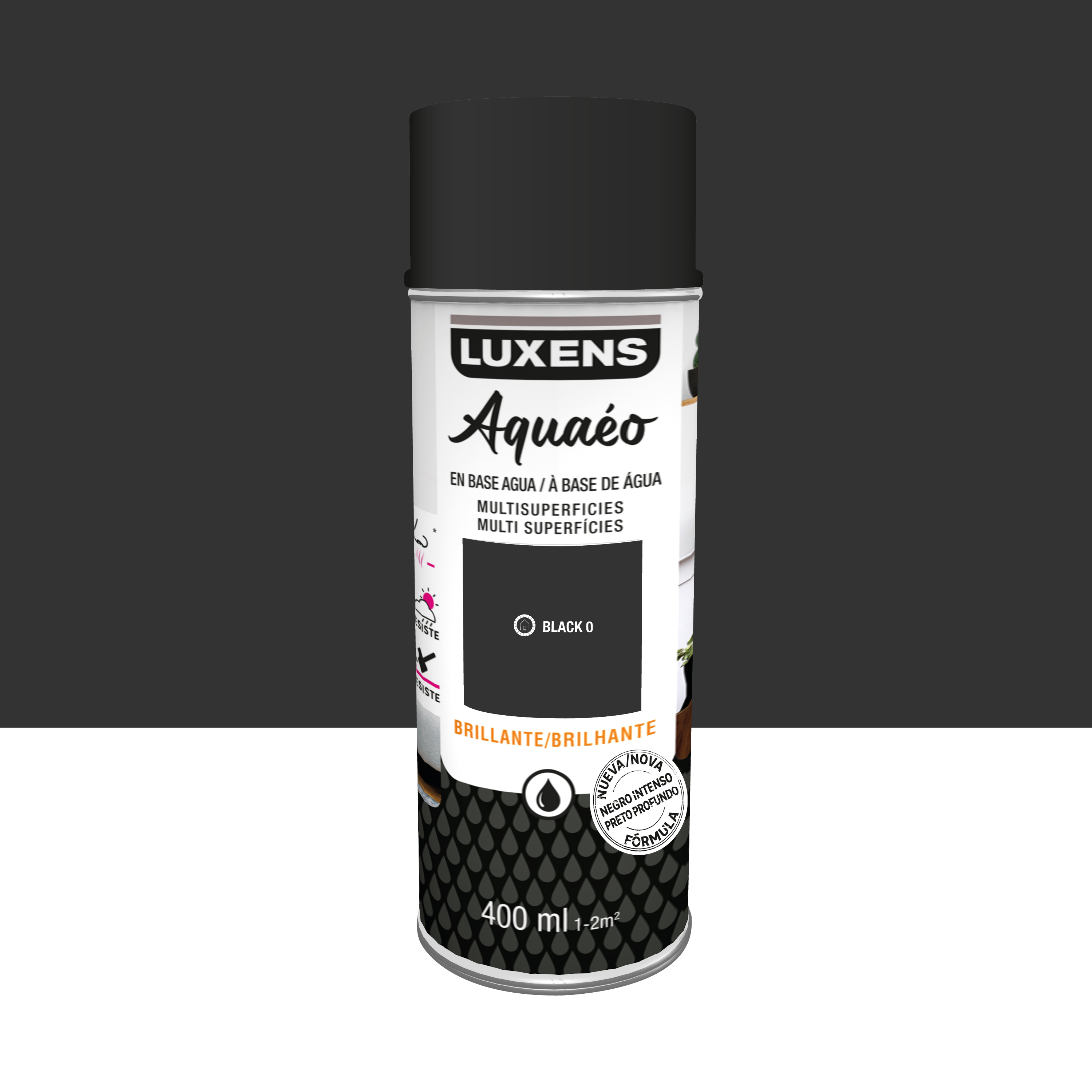 Spray decorativo Luxens color negro brillante. Es ideal para pintar y decorar tus soportes interiores y exteriores: acero, madera, vidrio, melamina y PVC. Gracias a su fórmula a base de agua, Aquaeo tiene menos olor que una pintura en aerosol a base de solvente y se puede aplicar en interiores sin imprimación. La pintura resiste todas las condiciones climáticas y los golpes y arañazos. Producto fabricado en la Unión Europea con 3 años de garantía. Contenido: 400 ml.