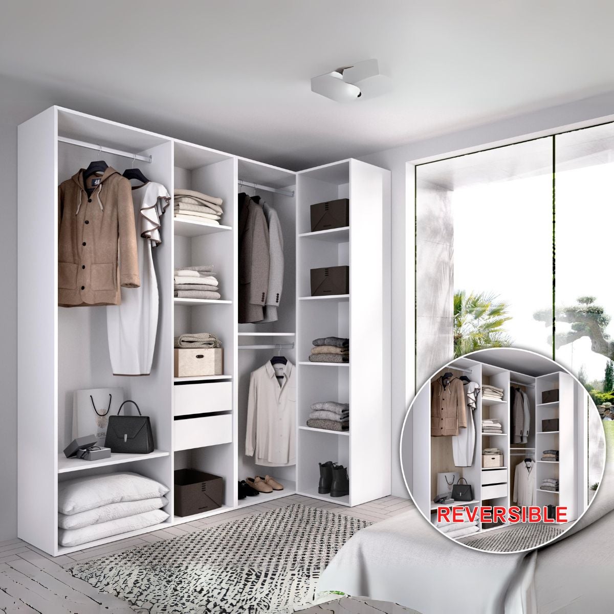 Armario-vestidor abierto de rincón formado por dos modulos y con varias zonas de almacenaje. Un modulo de rincón con 2 barras de colgar y zona con estantes y por otro lado un módulo con varias zonas de barras,estantes y dos practicos cajones. La trasera tiene doble acabado, blanco por un lado y Natural por el otro, lo que permite darle acabados distintos segun la necesidad, un montaje completamente blanco o con un toque de madera natural. Permite el montaje reversible, por lo que el modulo con cajones se puede ubicar tanto a la derecha como a la izquierda, adaptandose así a diferentes necesidades. Fabricado con materiales de 1ª calidad y resistencia, este vestidor es una excelente opción para aquellos que buscan practicidad y estilo en un solo mueble. CARACTERISTICAS:
