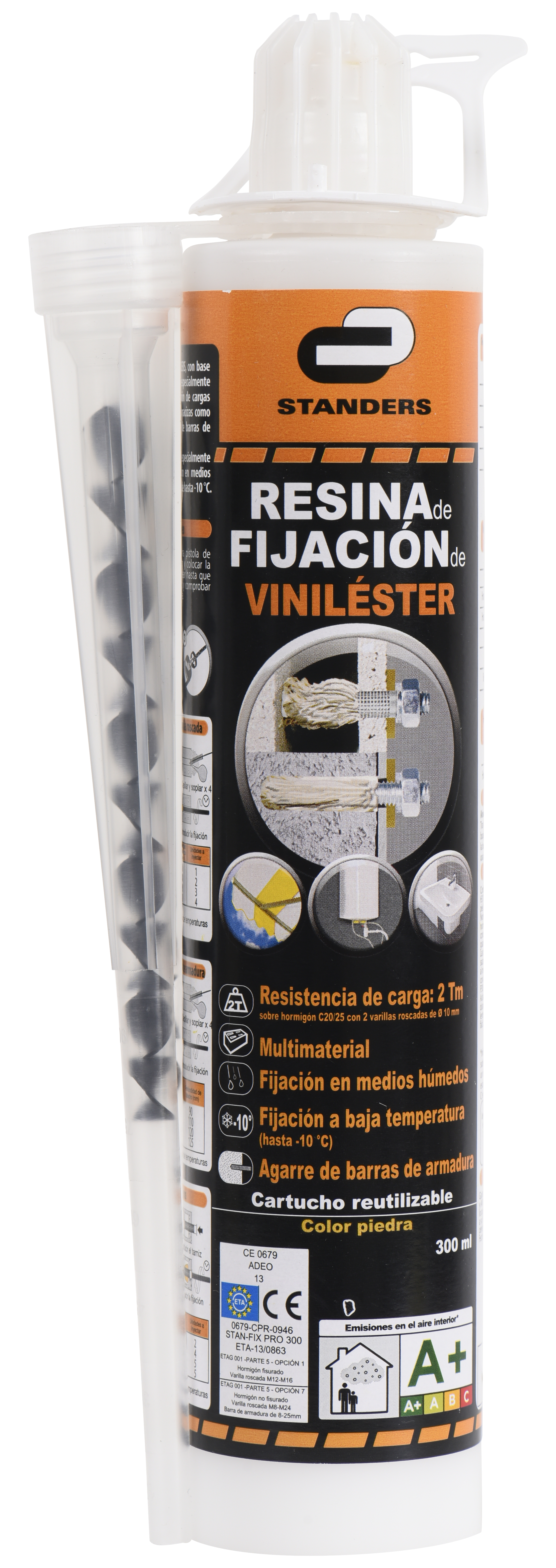 Taco de inyección Standers de resina de viniléster. Indicado para aplicar en todo tipo de materiales, incluye 2 mezcladores. No olvides leer las indicaciones del fabricante antes de su uso. Cantidad del envase: 300 ml.