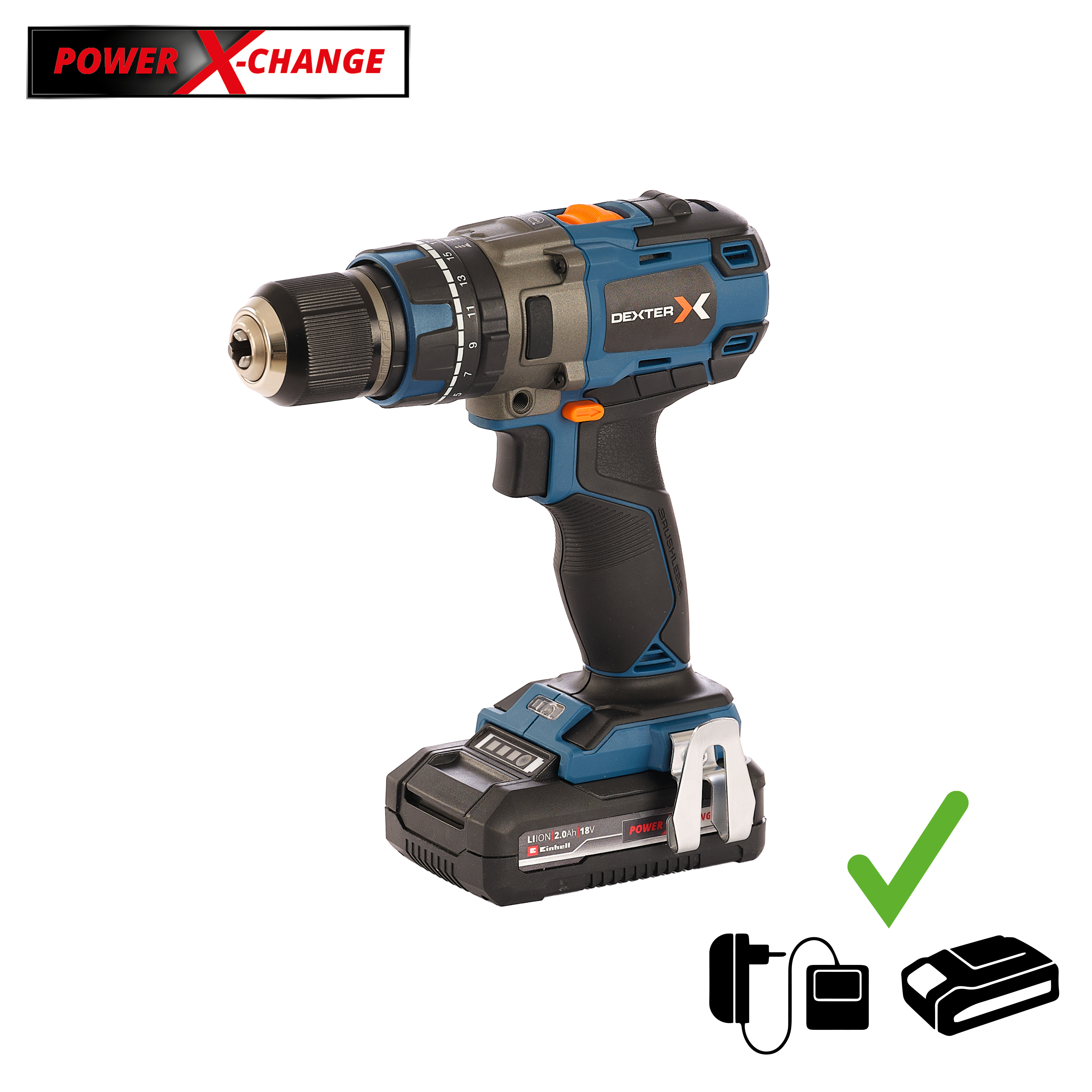 Taladro percutor a batería DEXTER POWER X-CHANGE 18V Brushless - 2 baterias - Cargador de batería