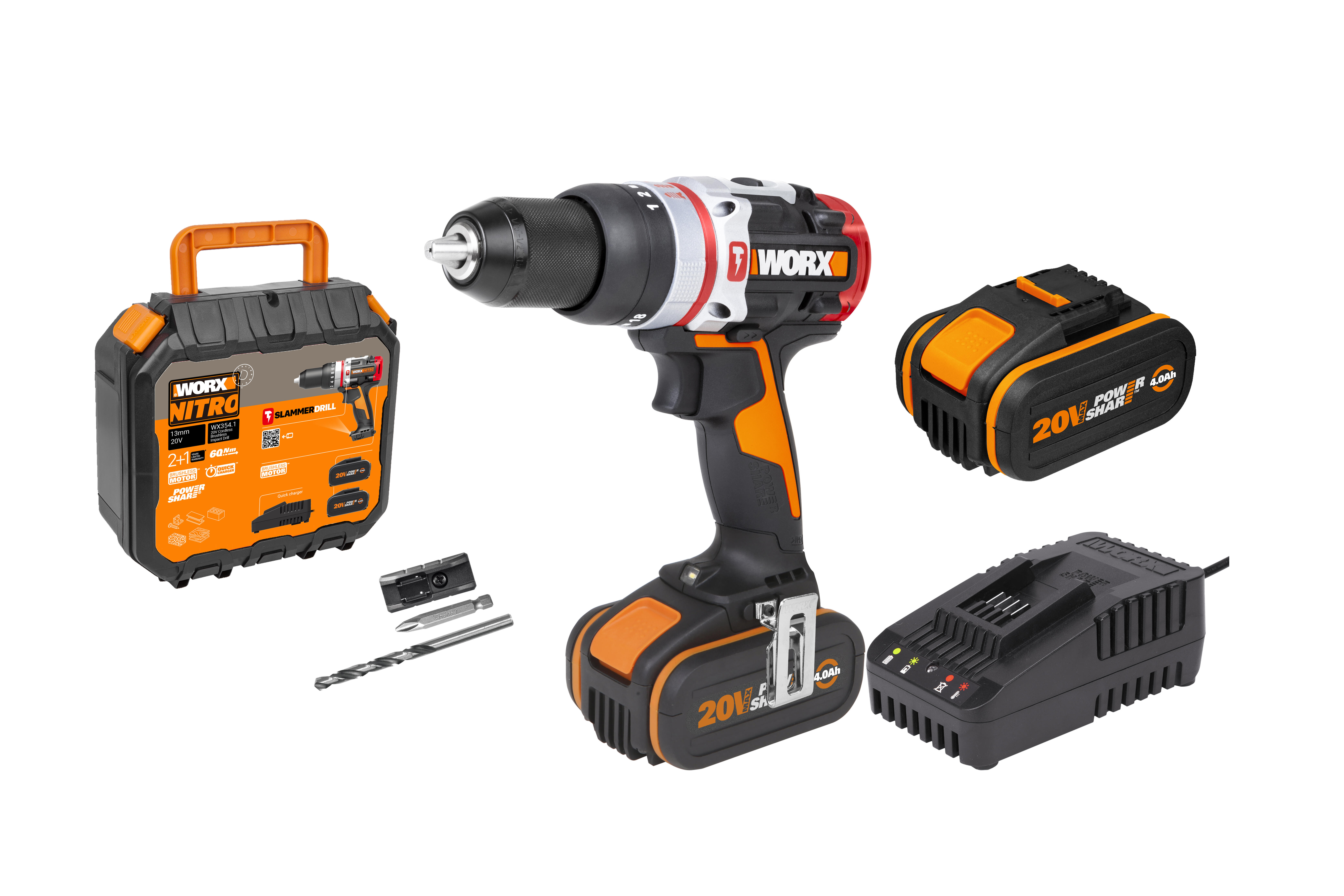 Taladro percutor WORX 20 V 60 Nm + 2 baterías de 4.0 Ah + Accesorios - Compatible con Powershare