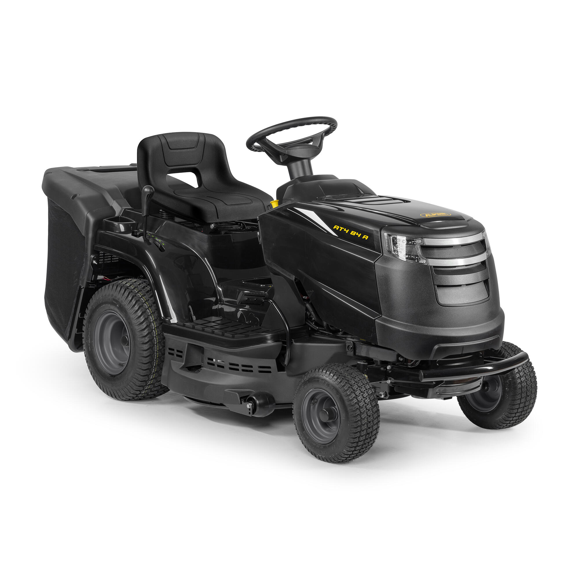 Tractor Alpina AT4 84 A 352 cc 84 cm ancho de corte. El AT4 84 A de 352 cc es un tractor cortacésped de transmisión manual con un motor monocilíndrico STIGA y una anchura de corte de 84 cm. Se entrega con un recogedor de 200 litros. Kit de mulching opcional.