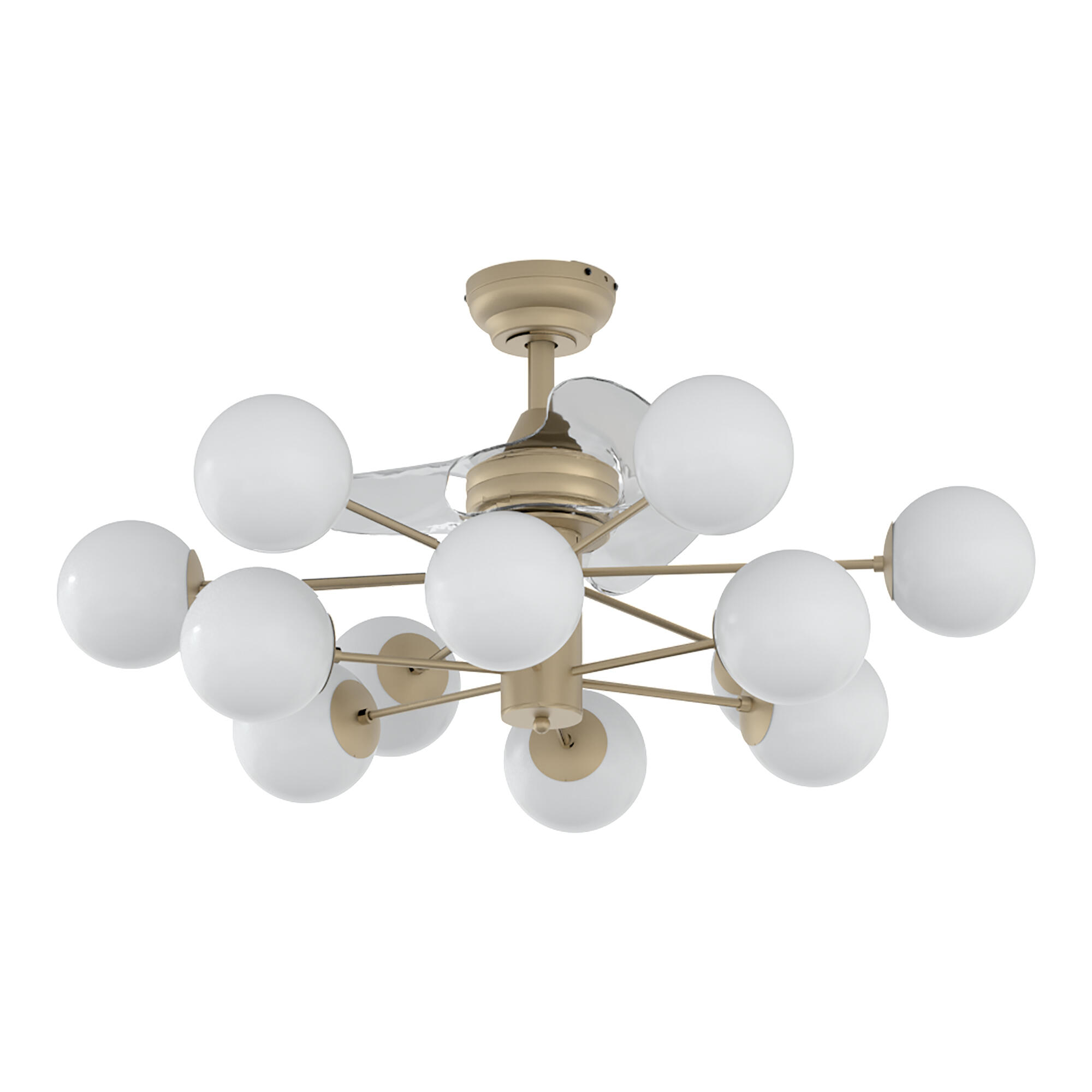 Ventilador de techo Noja con luz integrada, estructura en aluminio color bronce, aspas en PVC blanco con acabado esmaltado y pantallas de cristal. Cuenta con motor DC (corriente directa), que, como ventaja frente a los motores AC (corriente alterna), es más eficiente, reduce el consumo de energía hasta un 70%, proporciona una sensación ultrasilenciosa (disminuye el nivel sonoro hasta en un 50% frente a aparatos con motor AC), evita que el aparato se mueva y tambalee, y crea un buen movimiento de aire con más nivel de velocidad en la ventilación. Además, son motores pequeños y duraderos. El ventilador tiene 3 aspas, 6 velocidades y funciona con mando a distancia que incluye función temporizador. Se trata de un diseño elegante y contemporáneo que puede utilizarse en estancias de hasta 30 m². La iluminación se compone de 12 luces con forma de globo. Incluye función reversible (invierno-verano), que consiste en invertir el giro de las aspas en invierno y mover hacia abajo el aire caliente acumulado en el techo, lo que permite mejorar el rendimiento de la calefacción y contribuir al ahorro energético. Este producto mejora el confort térmico y ayuda a alcanzar un ahorro de energía igual o superior al 60%. Medidas: 91 x 40 cm (anchura total x altura).
