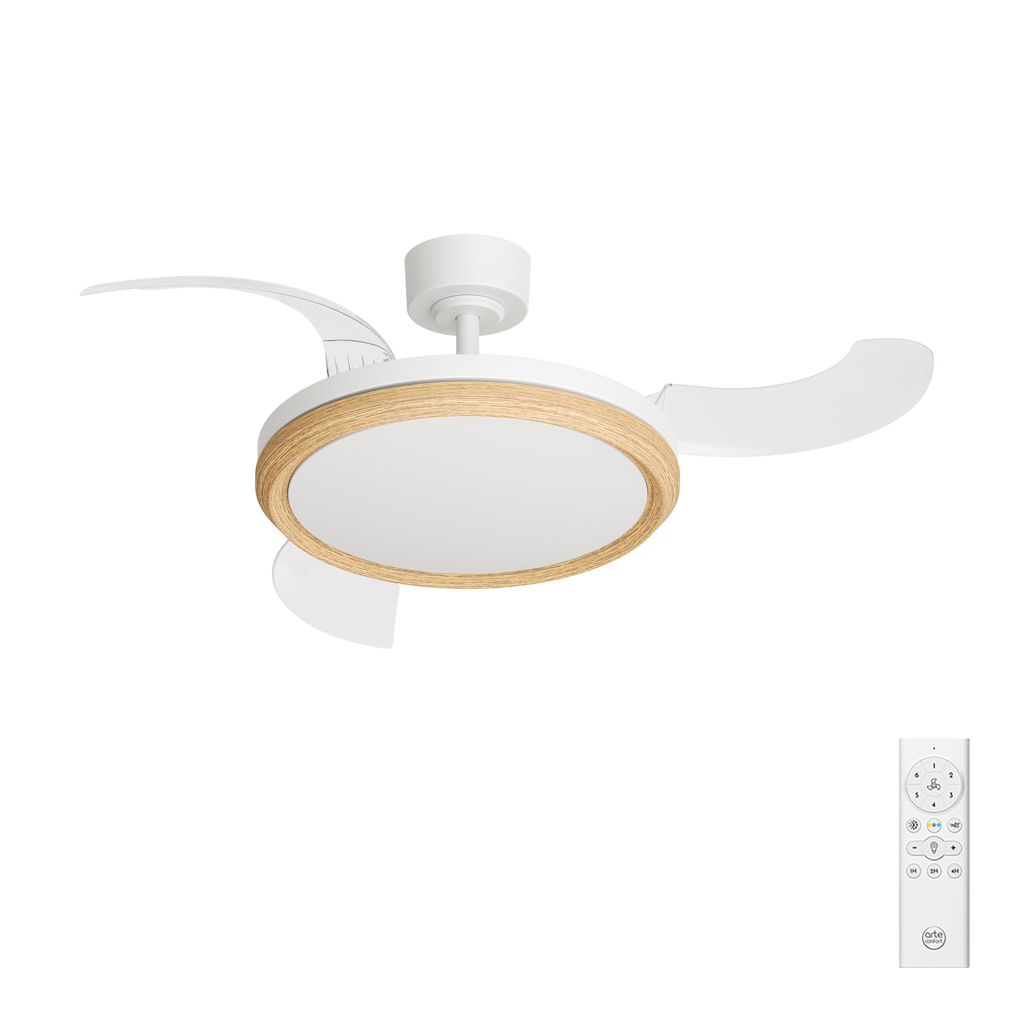 Ventilador de techo con luz ALVUS M con 3 aspas retráctiles de plástico PC y cuerpo metálico+plástico PP de color blanco mate con acabado en madera clara. Cuenta con temporizador(1/2/4h), variador de velocidad (6 velocidades) y función inversa verano/invierno, ya que invierte el giro de las palas y provoca una corriente contra el techo para modo invierno. Motor DC muy silencioso 30W, luz dimable LED 30W 3300Lm TªColor 3000/4000/6500K. Diametro cuerpo 40cm. Diametro aspas desplegadas 91cm. Altura regulable 32,5/45cm. Eficiencia energetica F. Este producto es reparable y tiene una garantía de 8 años en motor y 5 años para el resto de los componentes.