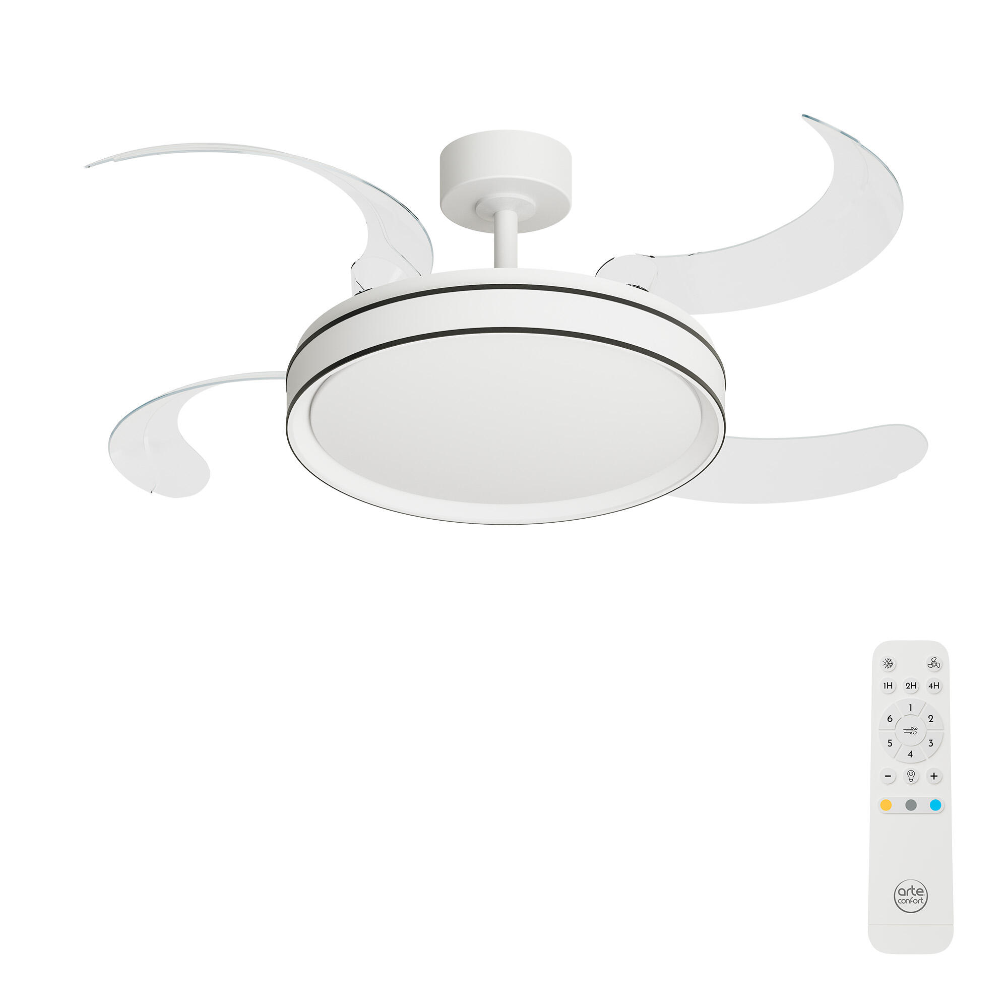 Ventilador de techo con luz DUBE L con 4 aspas retractiles de plástico PC y cuerpo metálico de color blanco + negro. Cuenta con temporizador(1/2/4h), variador de velocidad (6 velocidades) y función inversa verano/invierno, ya que invierte el giro de las palas y provoca una corriente contra el techo para modo invierno. Motor DC muy silencioso 30W, luz dimable LED 30W 3300Lm TªColor 3000/4000/6500K. Diametro cuerpo 48cm. Diametro aspas desplegadas 122cm. Altura regulable 34,5/47,2cm. Eficiencia energetica F. Este producto es reparable y tiene una garantía de 8 años en motor y 5 años para el resto de los componentes.