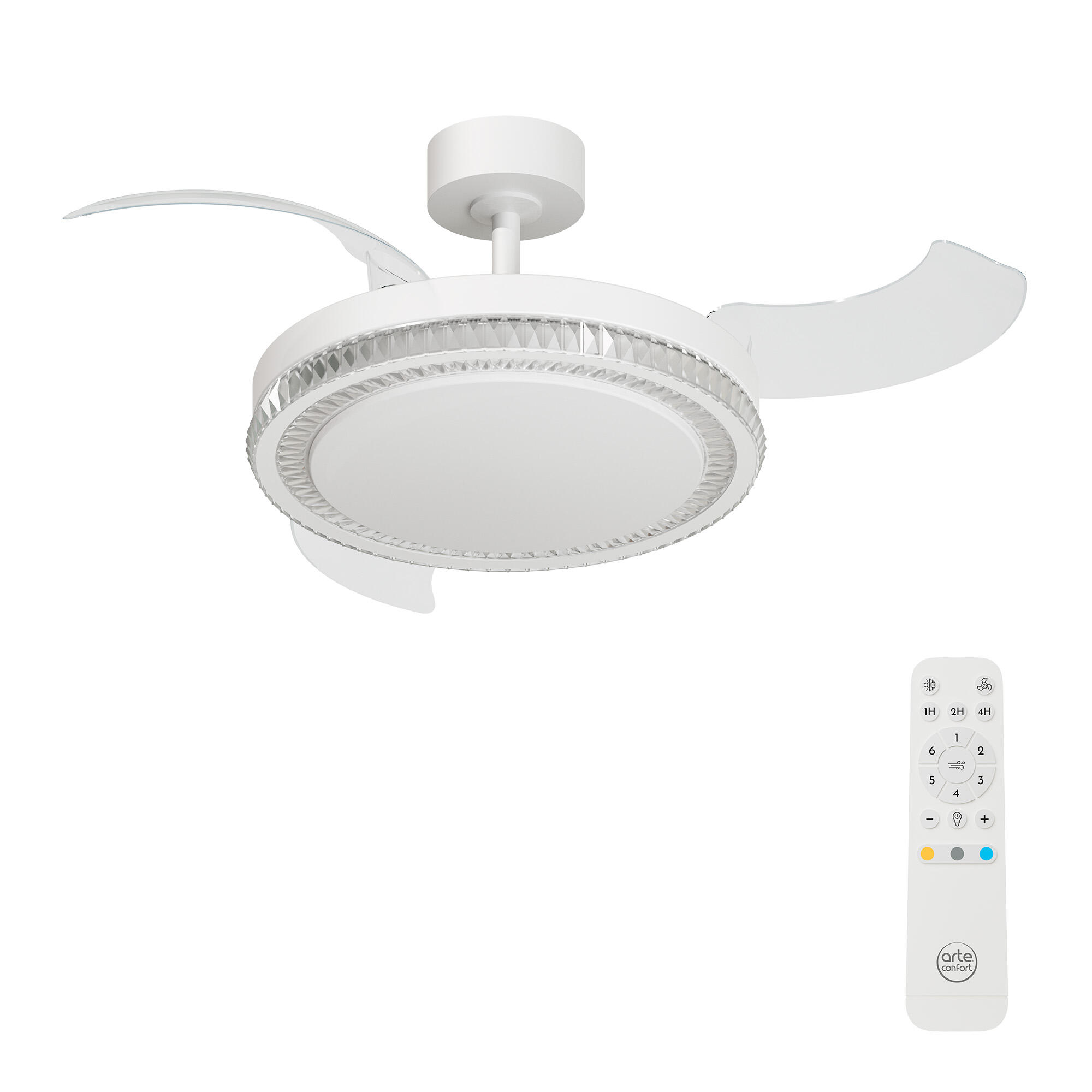 Ventilador de techo con luz EURIA M con 3 aspas retráctiles de plástico PC y cuerpo metálico de color blanco. Cuenta con temporizador(1/2/4h), variador de velocidad (6 velocidades) y función inversa verano/invierno, ya que invierte el giro de las palas y provoca una corriente contra el techo para modo invierno. Motor DC muy silencioso 30W, luz dimable LED 30W 3300Lm TªColor 3000/4000/6500K. Diametro cuerpo 48cm. Diametro aspas desplegadas 107cm. Altura regulable 34,3/47cm. Eficiencia energetica F. Este producto es reparable y tiene una garantía de 8 años en motor y 5 años para el resto de los componentes.