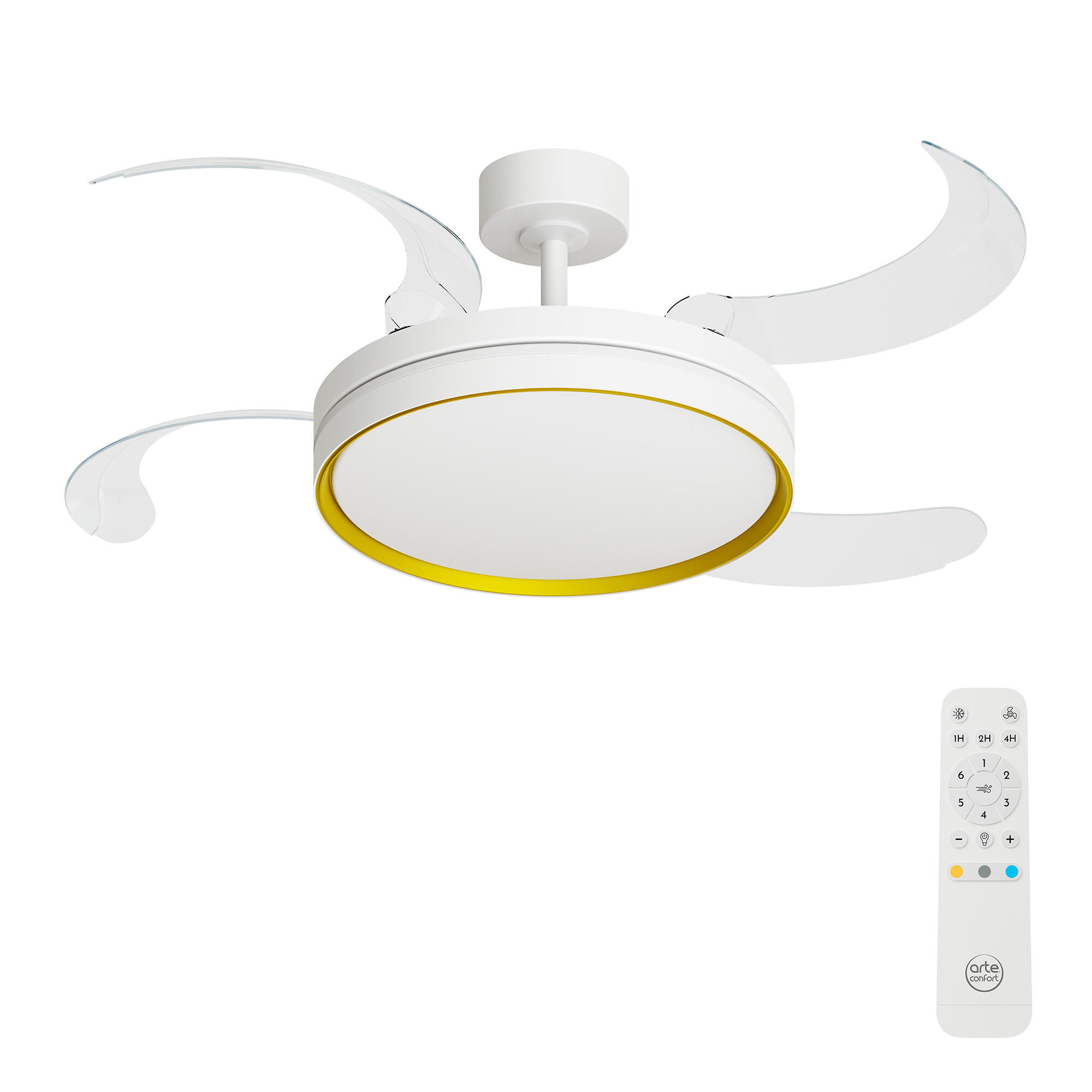 Ventilador de techo con luz SELAS L con 4 aspas retractiles de plástico PC y cuerpo metálico de color blanco. Cuenta con temporizador(1/2/4h), variador de velocidad (6 velocidades) y función inversa verano/invierno, ya que invierte el giro de las palas y provoca una corriente contra el techo para modo invierno. Motor DC muy silencioso 30W, luz dimable LED 30W 3300Lm TªColor 3000/4000/6500K. Diametro cuerpo 48cm. Diametro aspas desplegadas 122cm. Altura regulable 34,8/47,5cm. Eficiencia energetica F.Este producto es reparable y tiene una garantía 8 años en motor y 5 años resto de componentes, ponte en contacto con el servicio posventa de tu tienda para obtener más detalles.