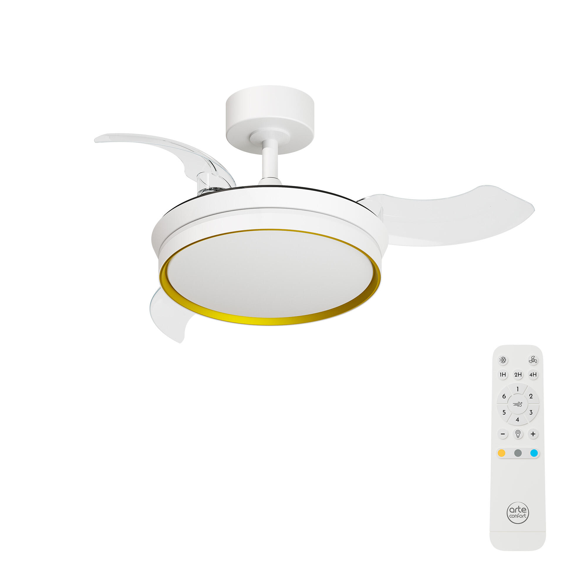 Ventilador de techo con luz SELAS S con 3 aspas retráctiles de plástico PC y cuerpo metálico de color blanco + dorado. Cuenta con temporizador(1/2/4h), variador de velocidad (6 velocidades) y función inversa verano/invierno, ya que invierte el giro de las palas y provoca una corriente contra el techo para modo invierno. Motor DC muy silencioso 22W, luz dimable LED 20W 2300Lm TªColor 3000/4000/6500K. Diametro cuerpo 40,2cm. Diametro aspas desplegadas 91cm. Altura regulable 33,3/46cm. Eficiencia energetica F.Este producto es reparable y tiene una garantía 8 años en motor y 5 años resto de componentes, ponte en contacto con el servicio posventa de tu tienda para obtener más detalles.