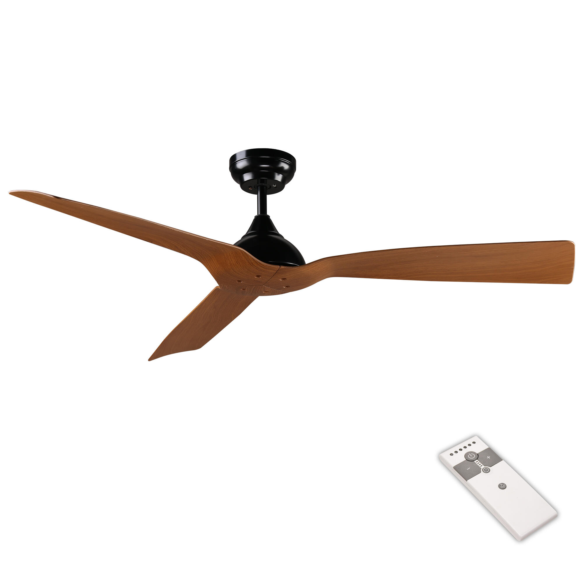 Ventilador de techo sin luz, con motor DC, 3 aspas y 6 velocidades y recomendado para estancias de más de 20 m². Su cuerpo está fabricado en aluminio resistente de color negro y las aspas de ABS de color wengué. Cuenta con motor DC (corriente directa), que, como ventaja frente a los motores AC (corriente alterna), es más eficiente, reduce el consumo de energía hasta un 70%, proporciona una sensación ultrasilenciosa (disminuye el nivel sonoro hasta en un 50% frente a aparatos con motor AC), evita que el aparato se mueva y tambalee, y crea un buen movimiento de aire con más nivel de velocidad en la ventilación. Incluye un mando a distancia radiofrecuencia, con variador de velocidad, para su funcionamiento. Gracias a su función inversa puedes utilizar el ventilador en invierno ya que invierte el giro de las palas y provoca una corriente contra el techo, que es donde se acumula el aire caliente, distribuyéndolo de manera uniforme por la estancia. Índice de protección IP44 (Uso exterior). Este producto mejora el confort térmico y ayuda a alcanzar un ahorro de energía igual o superior al 60%. Medidas: 132 x 25 cm (diámetro x alto). 3 años de garantía. Entrega a pie de vehículo